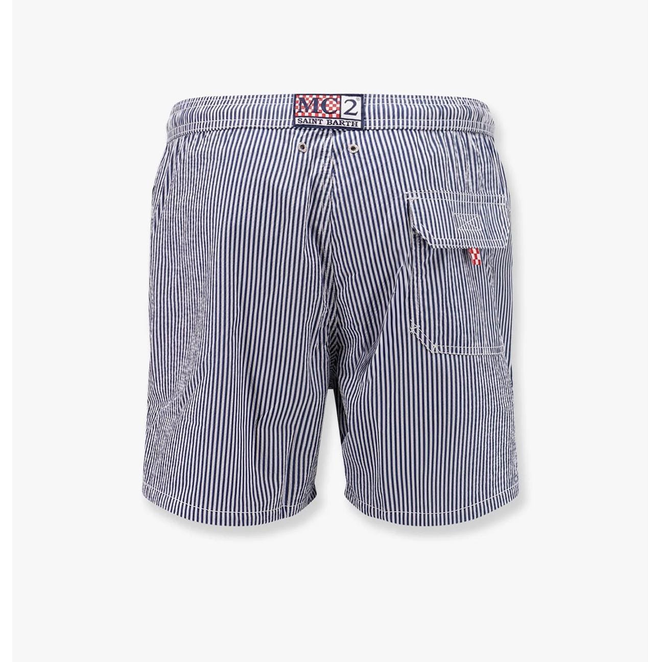 Il costume mare Patmos è realizzato in tessuto seersucker a rapida asciugatura, con una texture che ricorda il cotone. Il design è arricchito da cuciture a contrasto e cordino regolabile, oltre al logo esclusivo Saint Barth ricamato sul fondo della gamba. Presenta una tasca sul retro con pattina e chiusura in velcro. Questa versione è realizzata con un tessuto seersucker a righe verticali, che dona un look elegante e fresco.