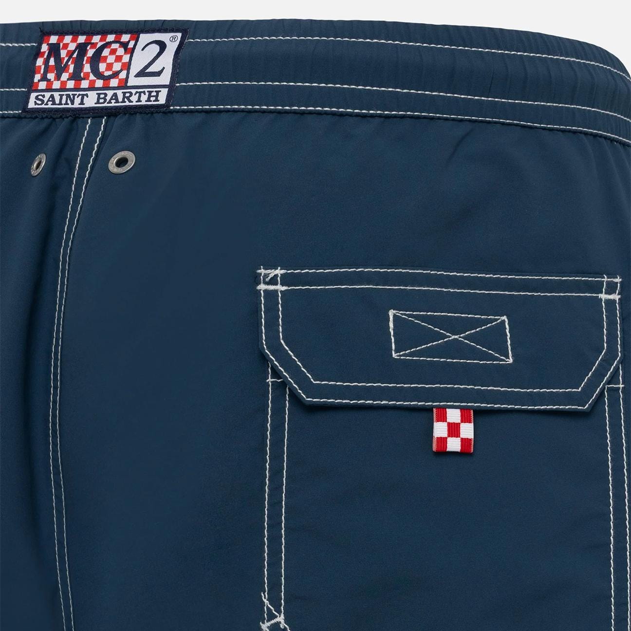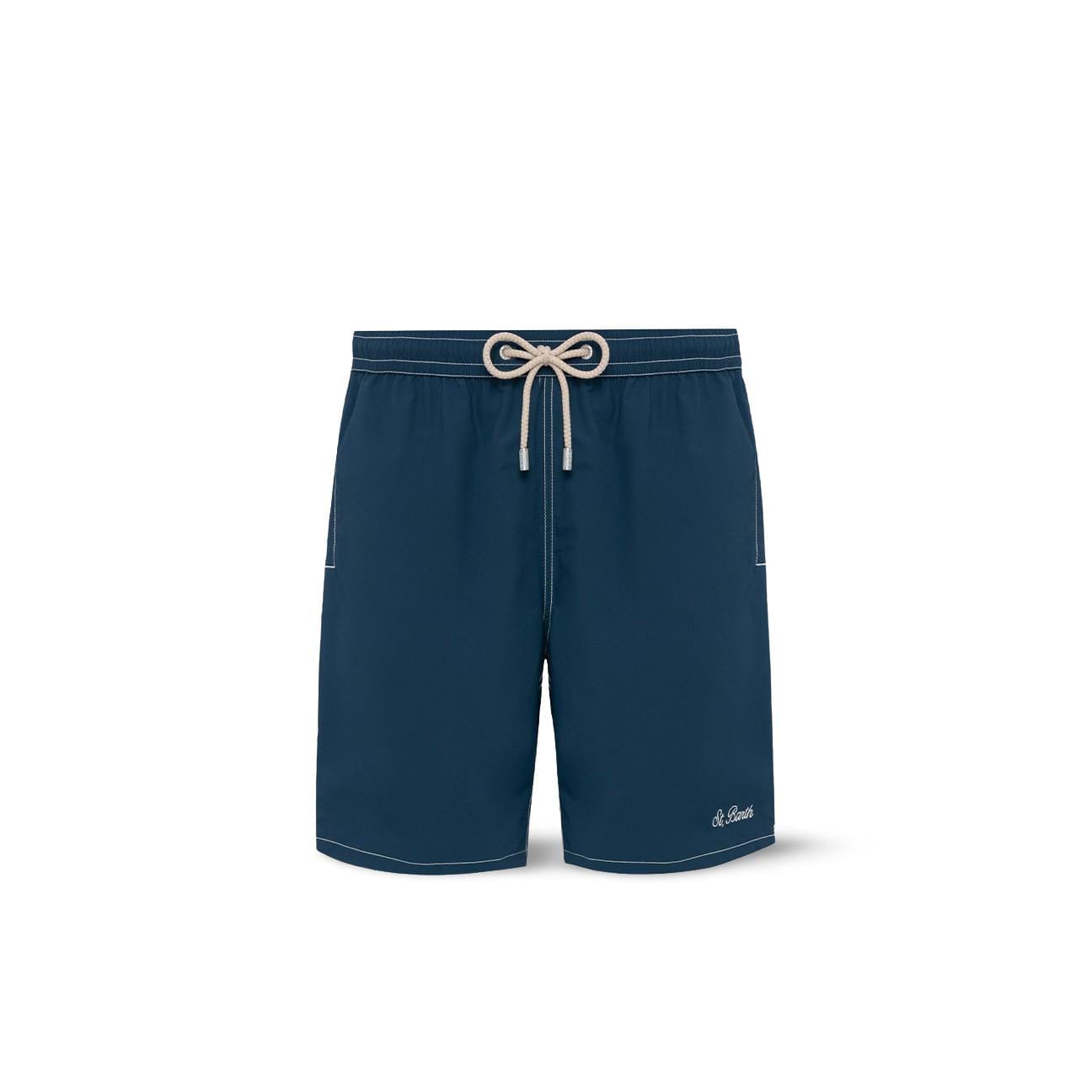 Vestibilità Classic Fit Vita elasticizzata comodaCordino regolabile con terminali brandizzati Fodera interna in rete Tasche laterali con cuciture francesi Tasca posteriore con chiusura in velcro Occhielli brandizzati progettati per drenare l'acqua Etichetta esclusiva MC2 Saint Barth sul retro