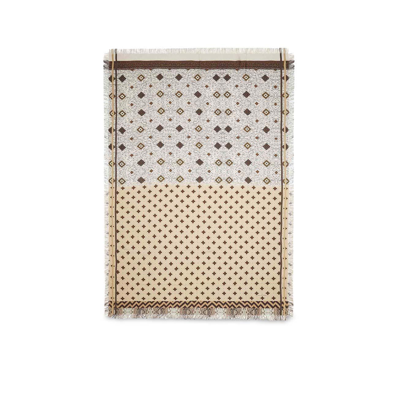 Questo scialle in seta stampata 135x195 cm presenta intricati motivi geometrici in tonalità naturali, che sprigionano un'eleganza dal fascino vintage. Il disegno armonioso è completato da delicati bordi sfrangiati, per un tocco di raffinata sofisticatezza. Indossalo sulle spalle come un morbido strato d'artista oppure trasformalo in un foulard da annodare tra i capelli per un look deciso e ricercato.