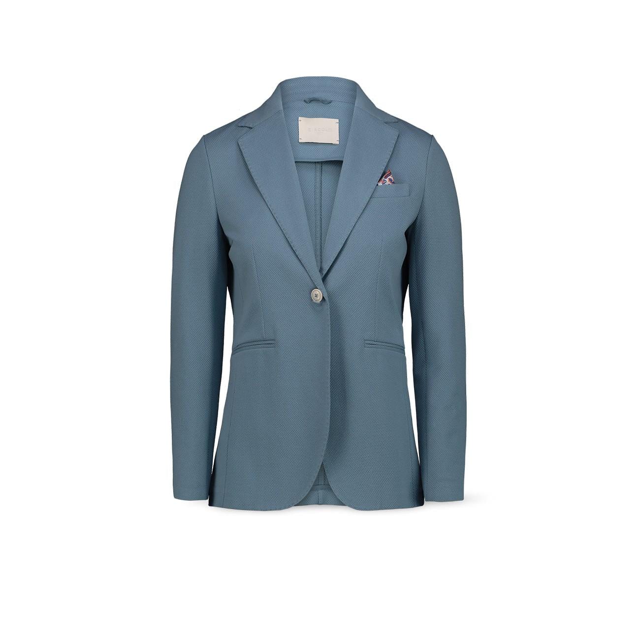 Esplora nuovi orizzonti con la giacca in un elegante tessuto jersey stretch. Il design monopetto e l'azzurro polvere lo rendono perfetto per un look sofisticato e di tendenza. Aggiungi un tocco di lusso alla tua collezione di giacche.