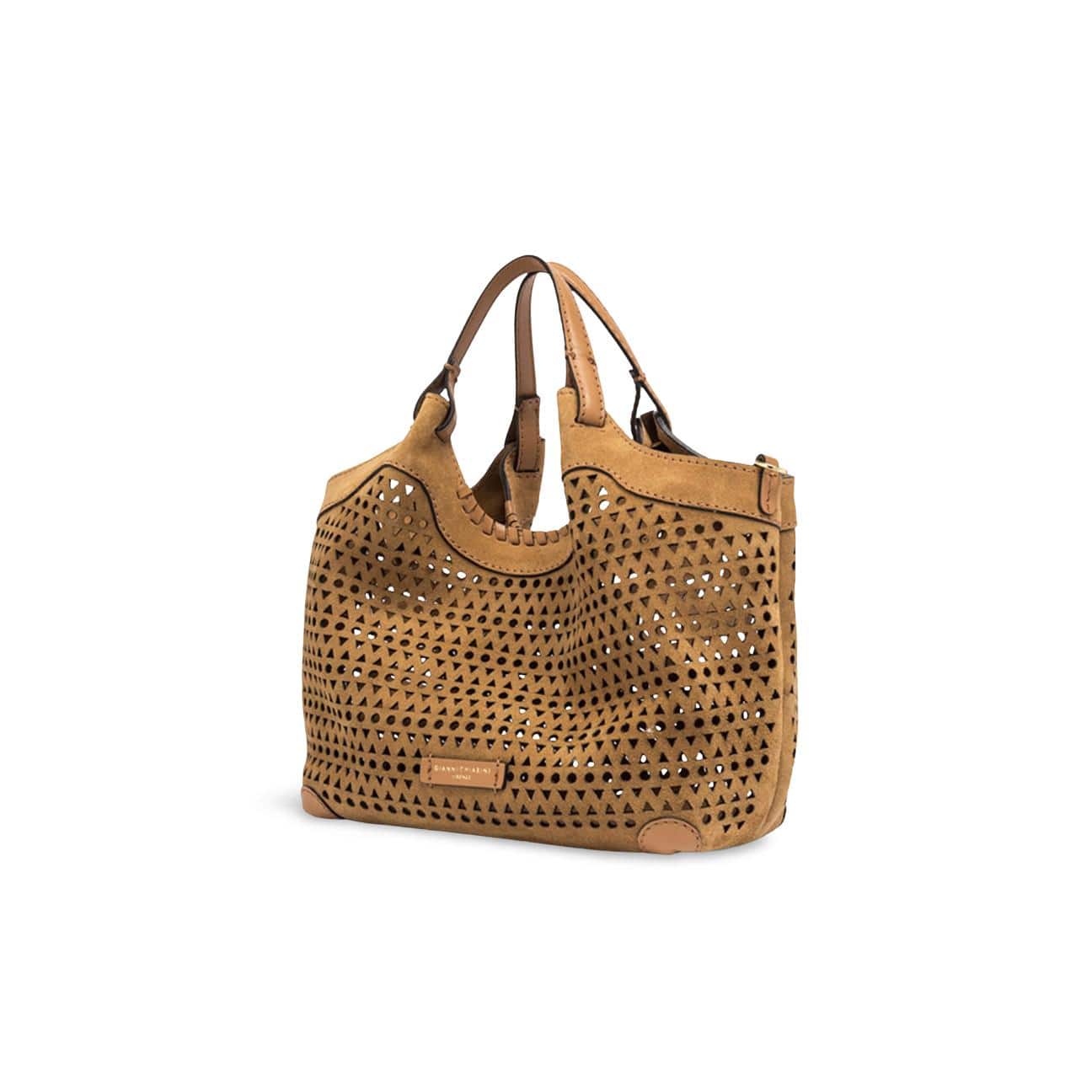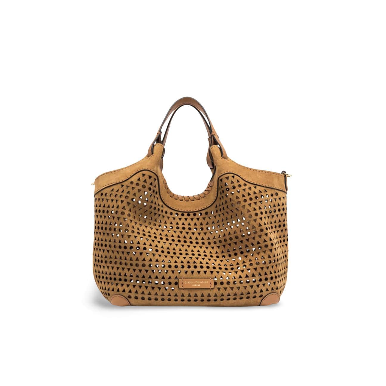 L'icona del brand DUA è caratterizzata da un design semplice al contempo contemporaneo. Realizzata in pelle di camoscio, si arricchisce dal decoro traforato. Uno splendido gioco di luce e trasparenze, di grande tendenza. Arricchita da una pochette con chiusura a zip per accentuarne la praticità