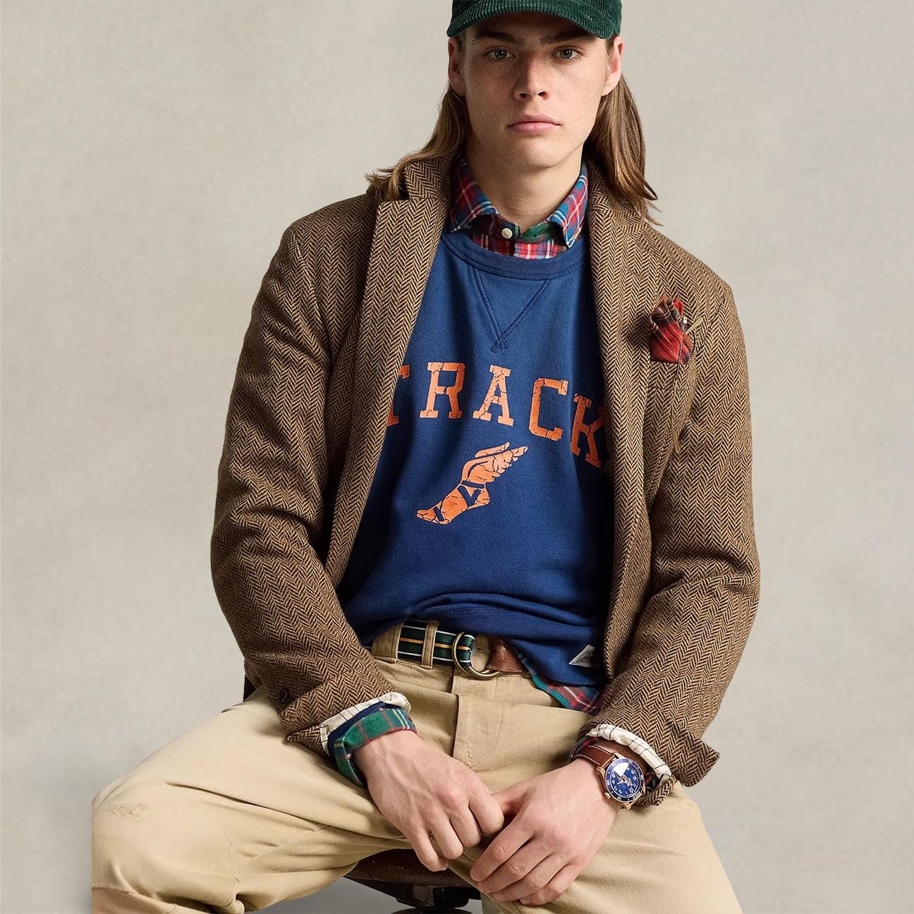 Vestibilità regolare, Taglio vintage: ispirato a un'autentica proporzione vintage con una spalla bassa più ampia. Taglio ampio sul torace con lunghezza del corpino leggermente ridotta. Girocollo con inserto a V a coste. Maniche lunghe con polsini a coste.<BR/>Scritta "Track" e grafica con piede alato stampate con effetto consumato al centro sul davanti.<BR/>Orlo a coste. Etichetta "Polo RL" sull'orlo sinistro.