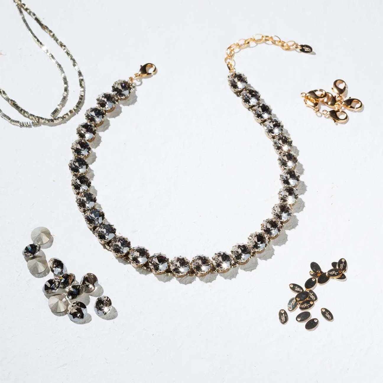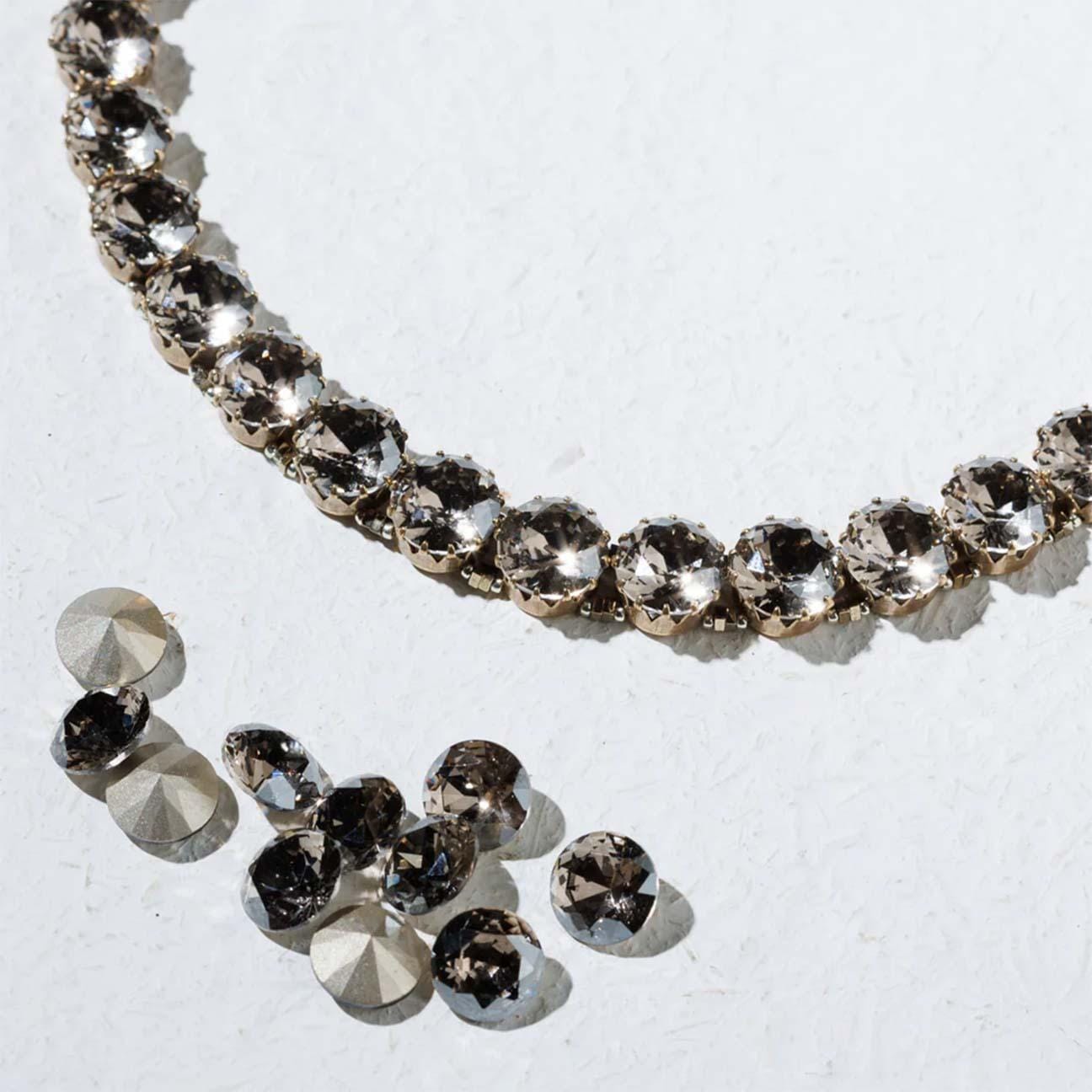 Realizzata con l'intreccio di mini conterie di vetro e schegge di ematite intorno a preziosi cristalli contenuti da piccole corone di ottone galvanizzato color oro antico.