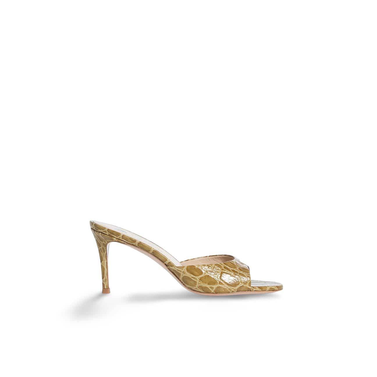 Sandali mule con tacco alto in stampa cocco, eleganti e contemporanei. Realizzati con tomaia effetto pelle di cocco dal finish lucido, si distinguono per la fascia ampia sul davanti che avvolge il piede con stile essenziale e raffinato.Il design slip-on con punta aperta valorizza la silhouette, mentre il tacco sottile slancia la figura garantendo femminilità e carattere. La soletta interna chiara, morbida e confortevole, assicura una calzata piacevole per tutta la giornata o la sera.