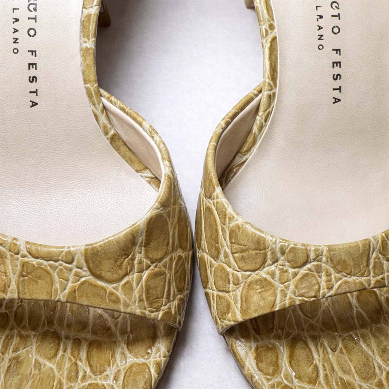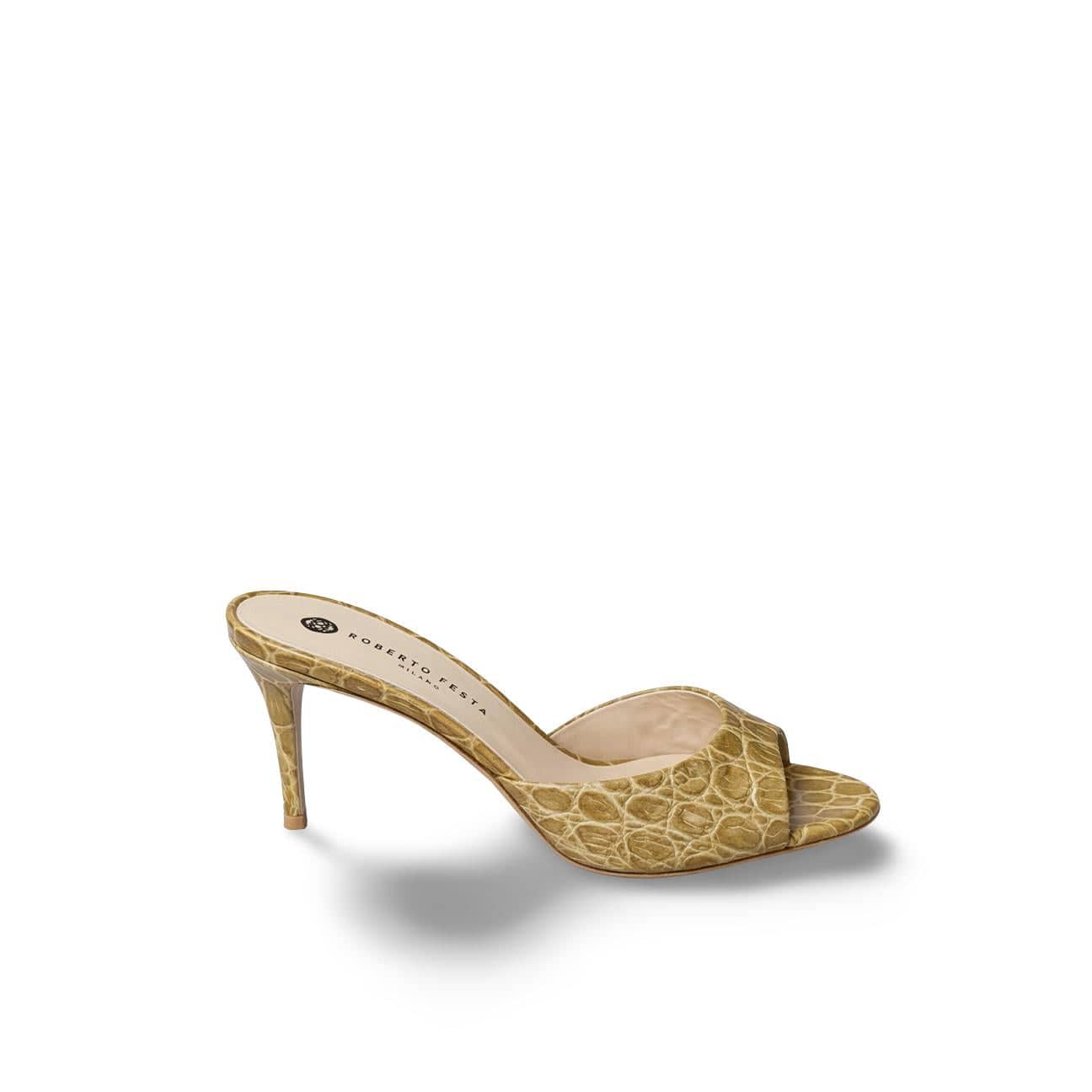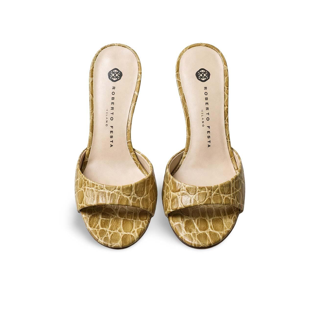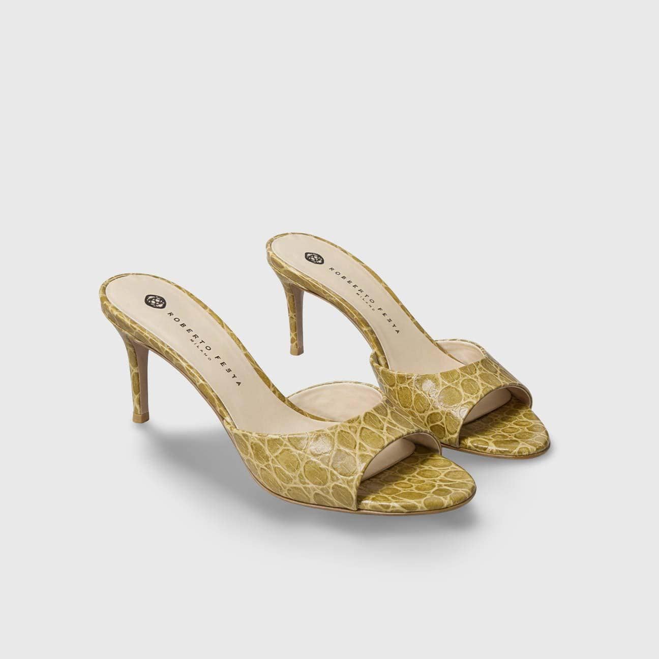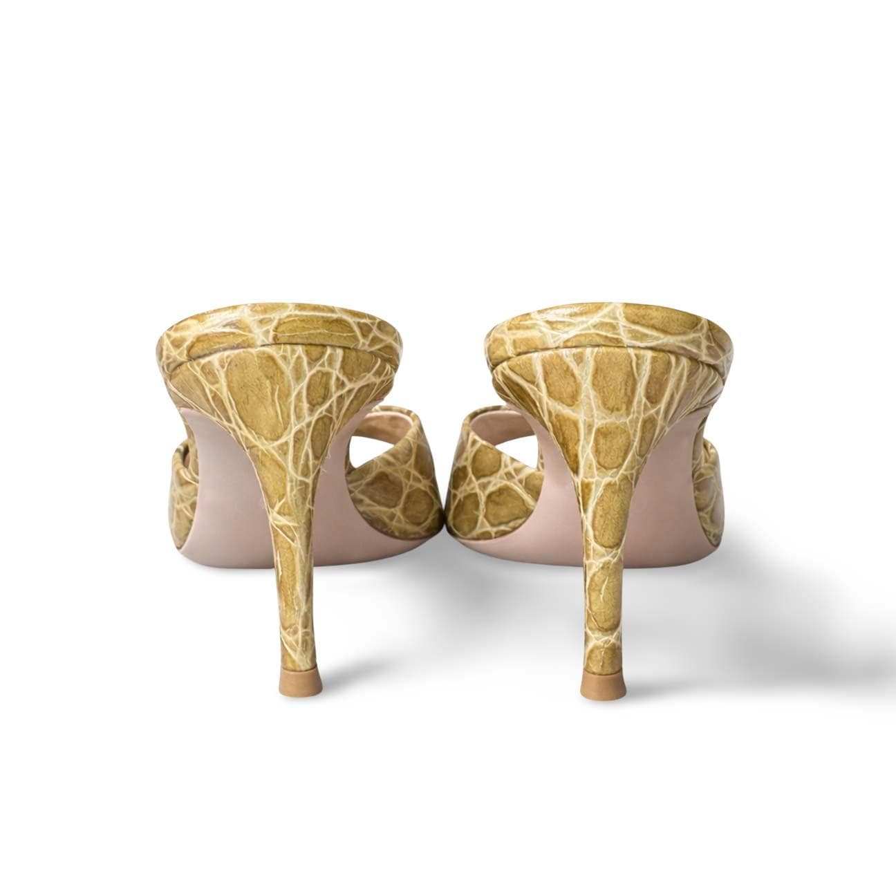 Sandali mule con tacco alto in stampa cocco, eleganti e contemporanei. Realizzati con tomaia effetto pelle di cocco dal finish lucido, si distinguono per la fascia ampia sul davanti che avvolge il piede con stile essenziale e raffinato.Il design slip-on con punta aperta valorizza la silhouette, mentre il tacco sottile slancia la figura garantendo femminilità e carattere. La soletta interna chiara, morbida e confortevole, assicura una calzata piacevole per tutta la giornata o la sera.