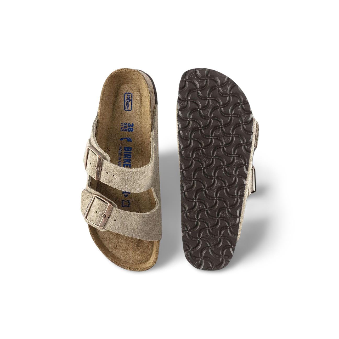 Schmal angelegtes Original BIRKENSTOCK Weichfußbett Plantar; anatomische Form Obermaterial: Wildleder Innensohle: Wildleder Sohle: EVA Details: individuell verstellbare Metallschnallen „Made in Germany“