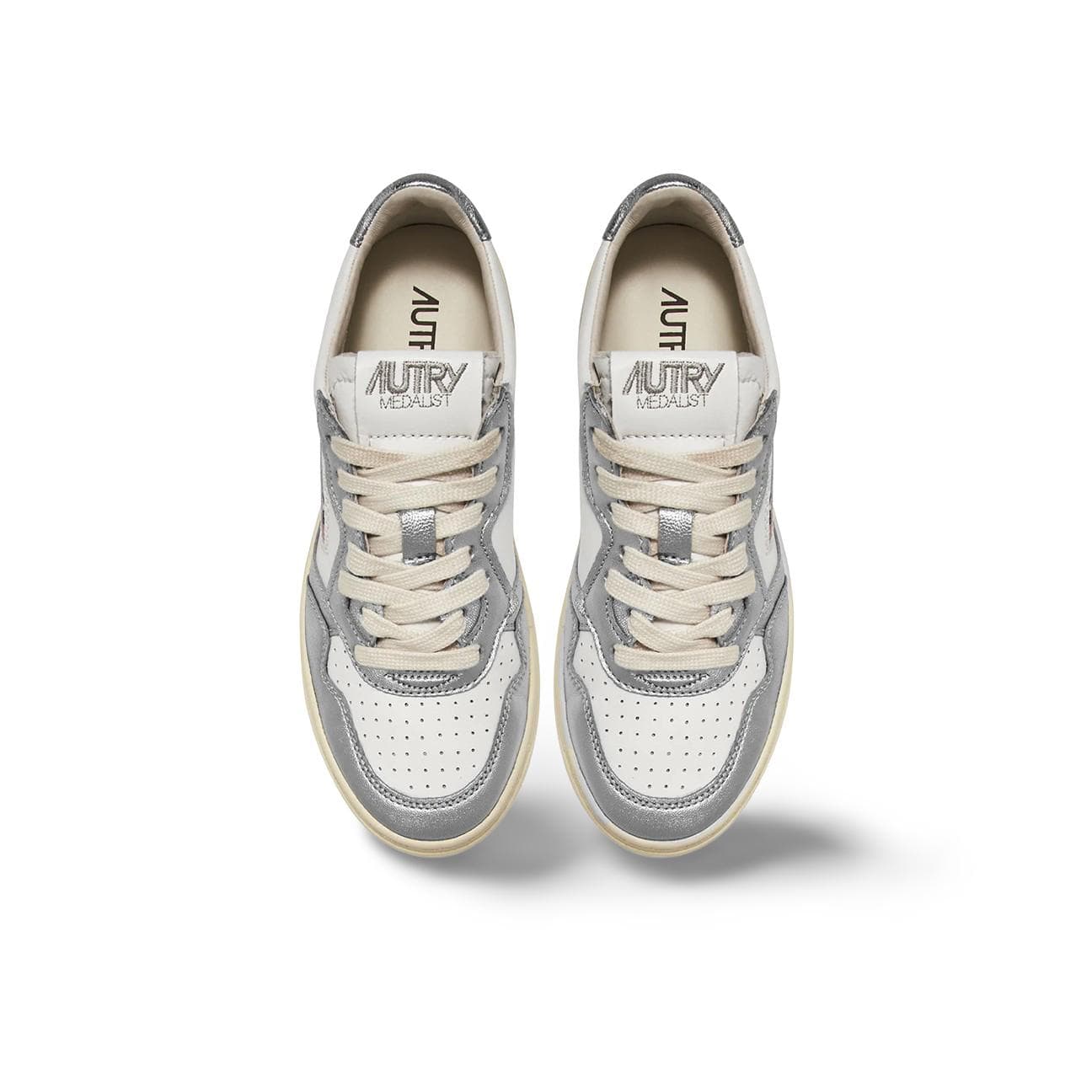 Obermaterial aus zweifarbigem weißem und silbernem Leder mit kontrastierenden, mehrschichtigen Ledereinsätzen. Flache Baumwollschnürsenkel mit farblich abgestimmtem Lederfutter , um 2 cm erhöht. Zweifarbige Logo-Sohle. Sohlenhöhe: 2,5–3,5 cm.