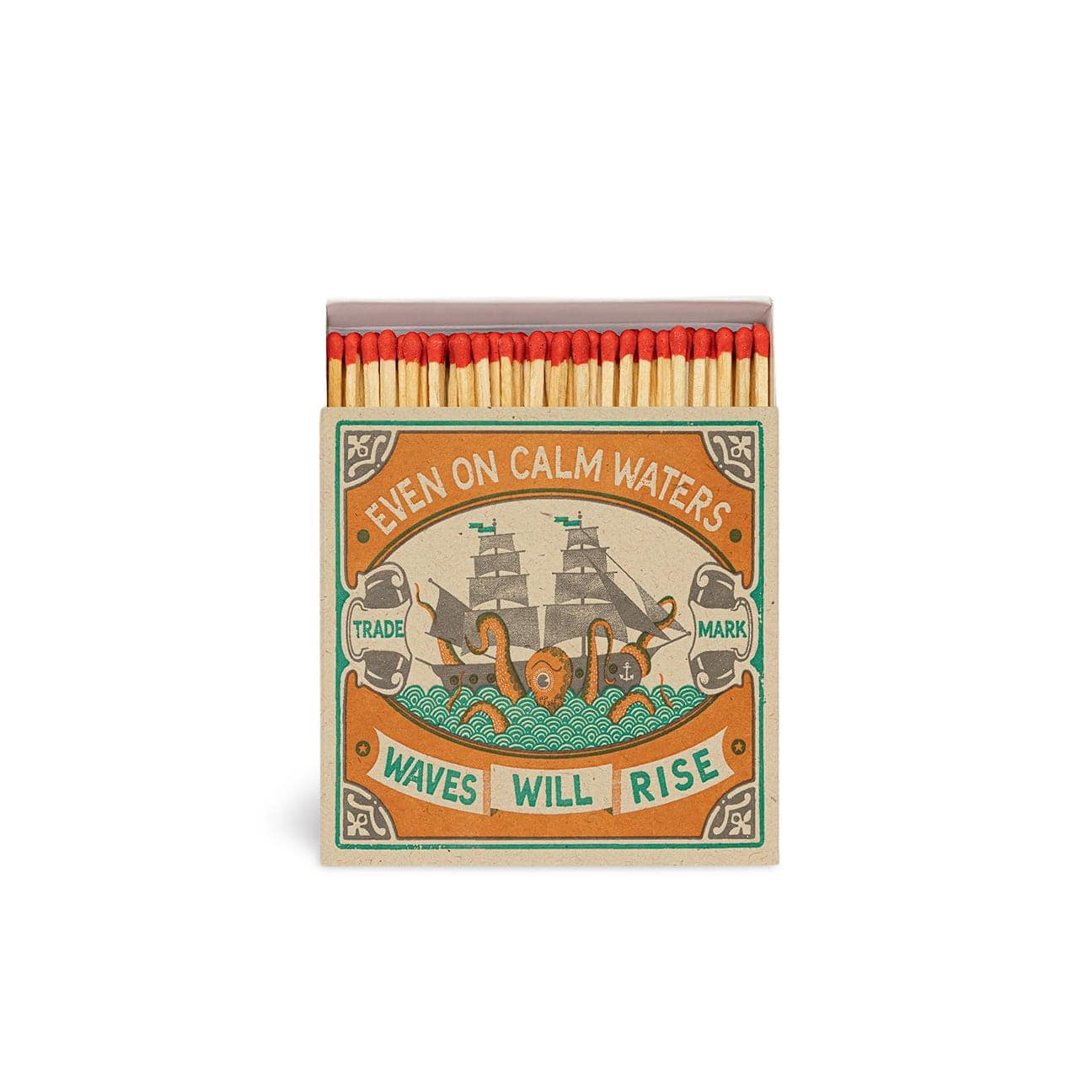 Let yourself be enchanted by the beauty and refinement of this Even on Calm Waters matchbox. Crafted with care and quality materials, this matchbox is a stylish addition to any home that includes elegant design elements. Let your environment enjoy its sophisticated and exclusive presence. Stunning design for this matchbox by Welsh artist Tom Frost pairs wise words with illustrations, "Even on still waters the waves will rise". Stop swimming!