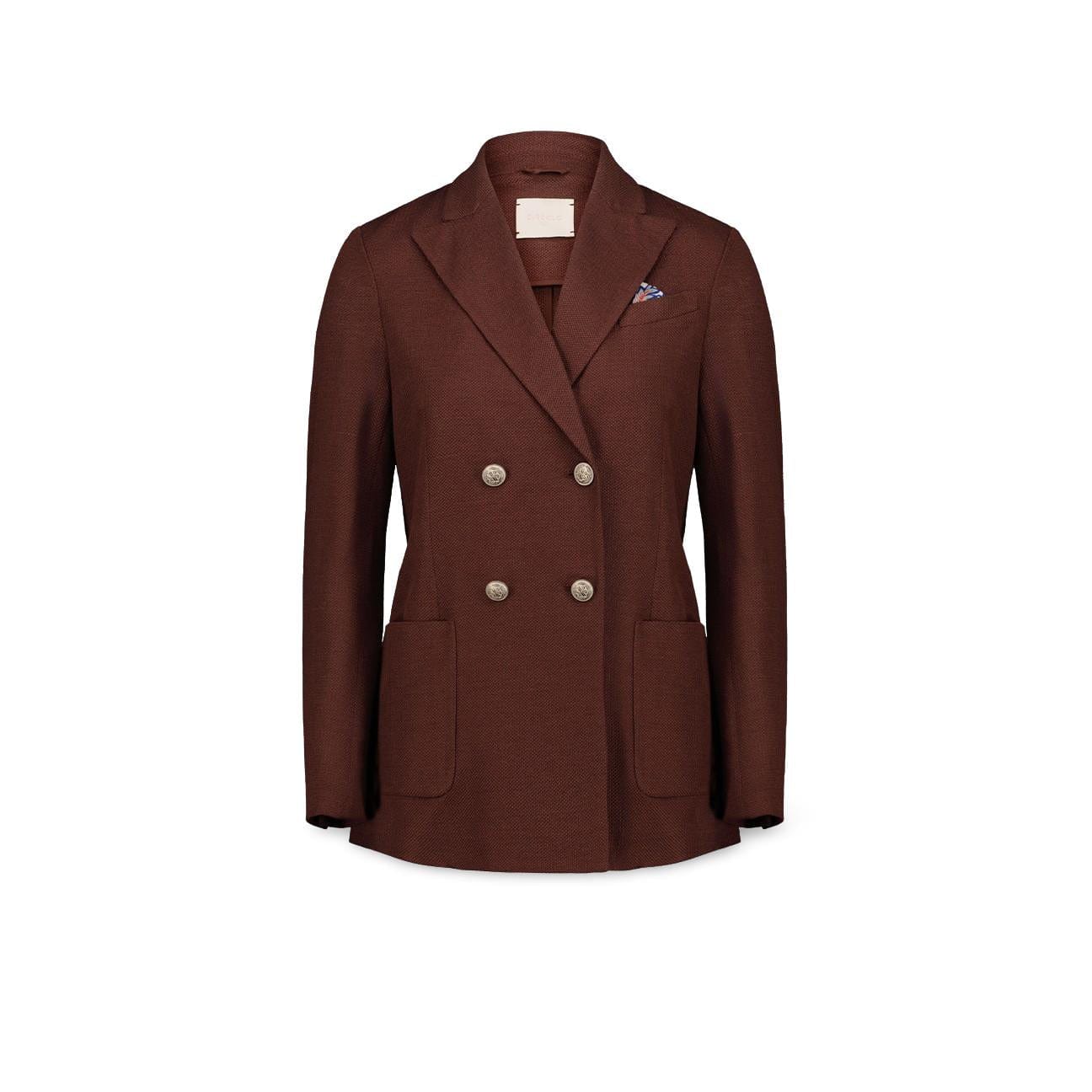 Esplora nuovi orizzonti con la giacca in un elegante tessuto di lino e cotone stretch. Il design doppiopetto e il caldo marrone lo rendono perfetto per un look sofisticato e di tendenza. Aggiungi un tocco di lusso alla tua collezione di giacche.