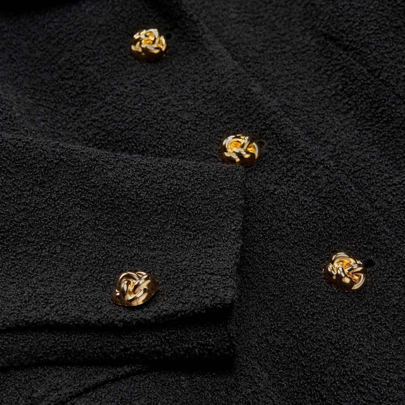 Raffinato blazer in tessuto bouclé nero firmato Tagliatore, caratterizzato da una linea sartoriale e da un'eleganza senza tempo. Il modello presenta un colletto con revers classici, chiusura frontale a tre bottoni dorati decorativi e tasche con patta sui fianchi. La struttura leggermente sfiancata valorizza la silhouette, mentre la fodera interna assicura comfort e vestibilità impeccabile.