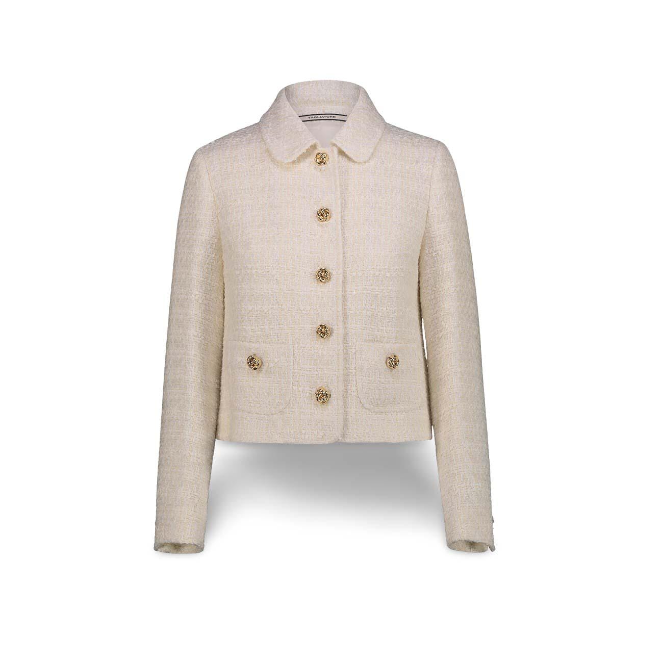 Elegante e senza tempo, questa giacca in tweed nero è un capo must-have per un guardaroba raffinato. Il design sartoriale presenta una linea dritta e leggermente corta, arricchita da luminosi bottoni gioiello che aggiungono un tocco sofisticato. Il colletto classico e le tasche frontali con patta completano lo stile, rendendola perfetta da abbinare sia a look formali che casual chic.