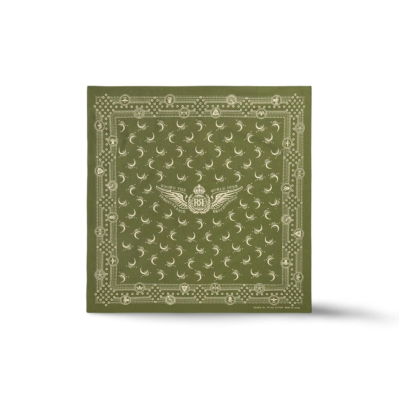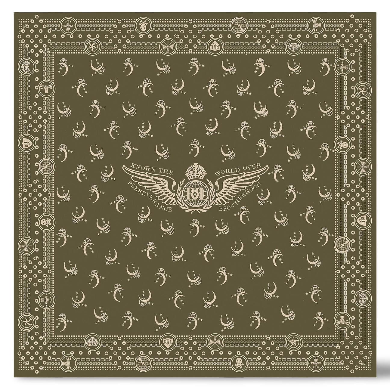 Measures 50.8cm x 50.8cm. "RRL", "Known the World Over", "Perseverance" and winged "Brotherhood" logo graphics printed in the center.