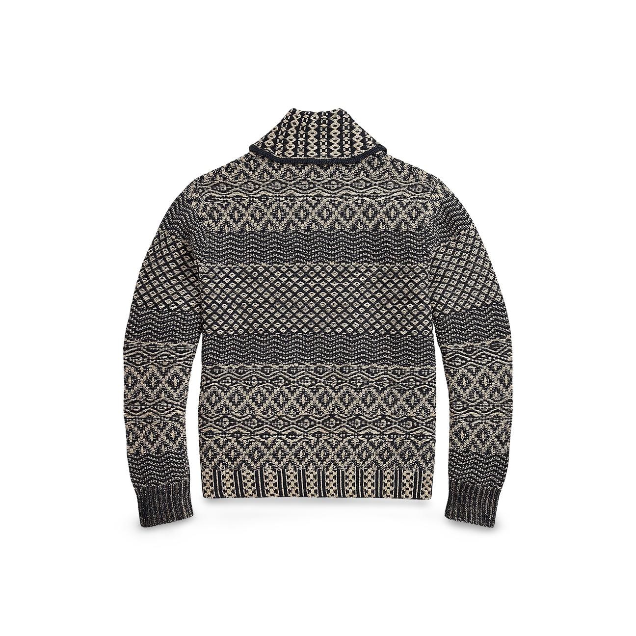 Shawl collar cardigan made with cotton, linen and wool yarns. Worked with a floating thread jacquard technique and multiple motifs. Inspired by carpets from the 1850s. Nautical-inspired "RRL & Co" graphics on the pockets. Ribbed cuffs with mottled yarns. Buttons with engraved anchor. Subjected to a special wash to obtain a vintage look.