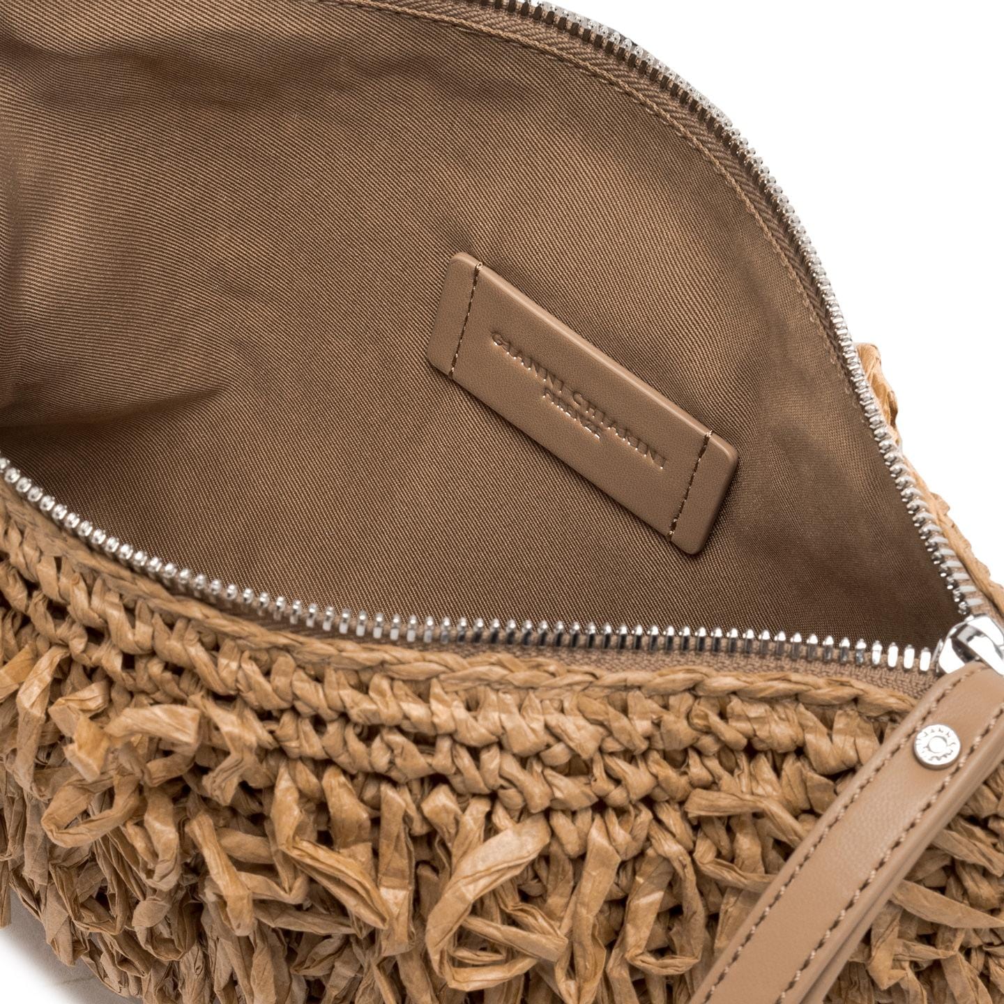 Frizzante et légère, la nouvelle pochette Marcella est un accessoire super chic mais en même temps décontracté. Habillée d'un tissu matière, composé de nombreux boucles de raphia, entrelacées à la main au crochet.