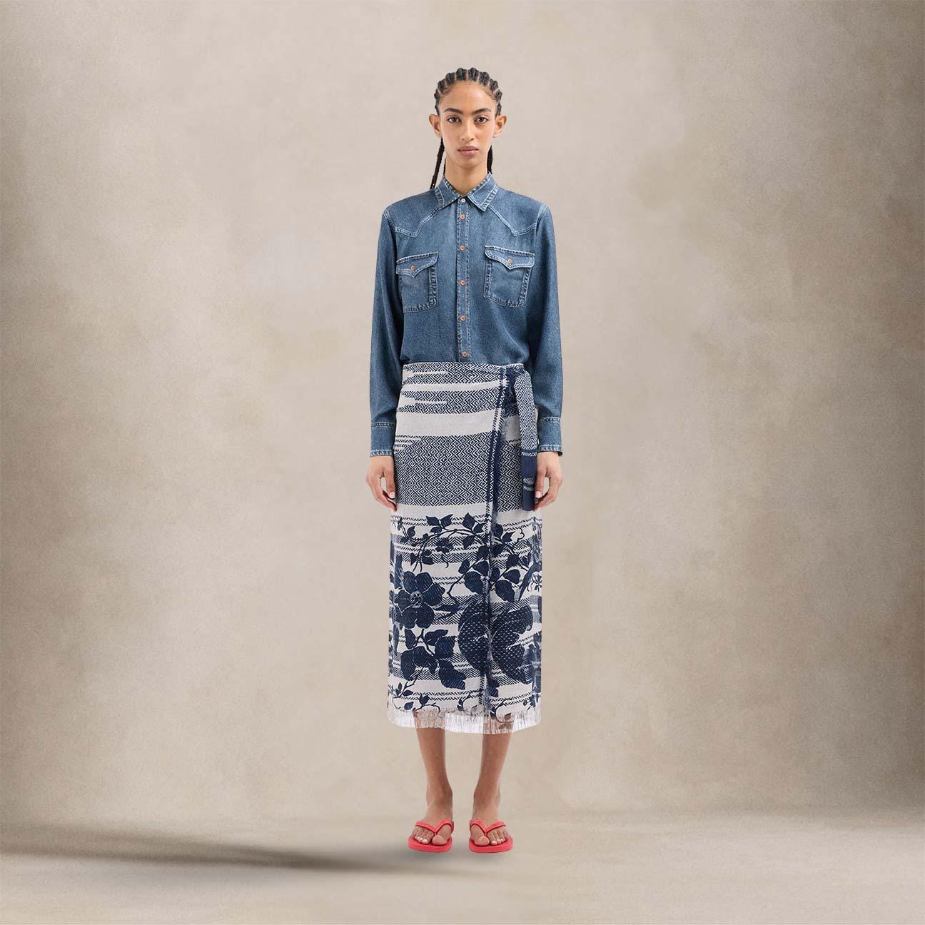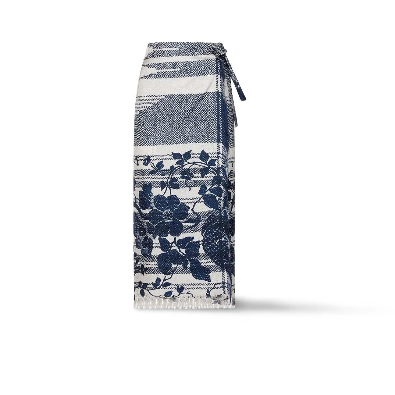 Questa raffinata gonna portafoglio è un armonioso connubio di delicati motivi floreali blu navy e disegni geometrici su una morbida base beige, che evoca un'eleganza senza tempo. Realizzata con una silhouette fluida e un orlo impreziosito da leggere frange, sprigiona una sofisticata allure artistica. Indossala con una camicia aderente e sandali con listini per un look chic senza sforzo.