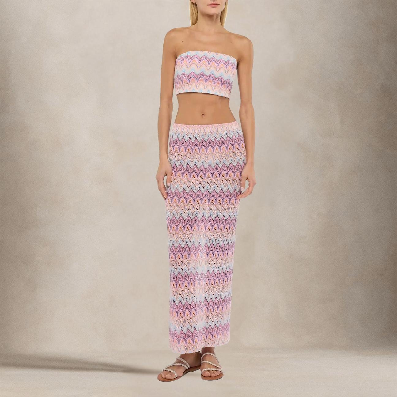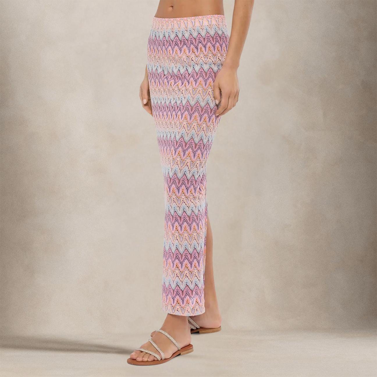 Colorata e raffinata, la gonna Caytlin è pensata per dare un tocco vibrante e sofisticato ai tuoi look estivi. Realizzata in leggero tessuto raschel, si distingue per il motivo chevron nei toni pastello e per la linea lunga e fluida che segue delicatamente il corpo. Puoi abbinarla al top coordinato per un effetto set irresistibile, oppure mixarla con capi basic per uno stile più casual.