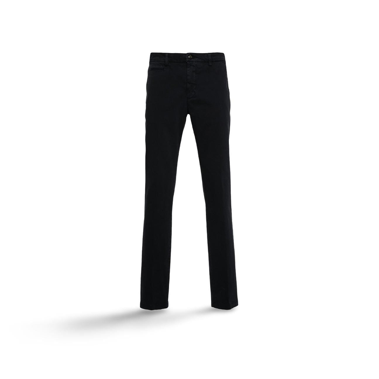Coupe slim, deux poches latérales en biais, poche gousset, longueur cheville, deux poches passepoilées arrière avec bouton, coupe slim, fermeture zippée dissimulée et bouton.