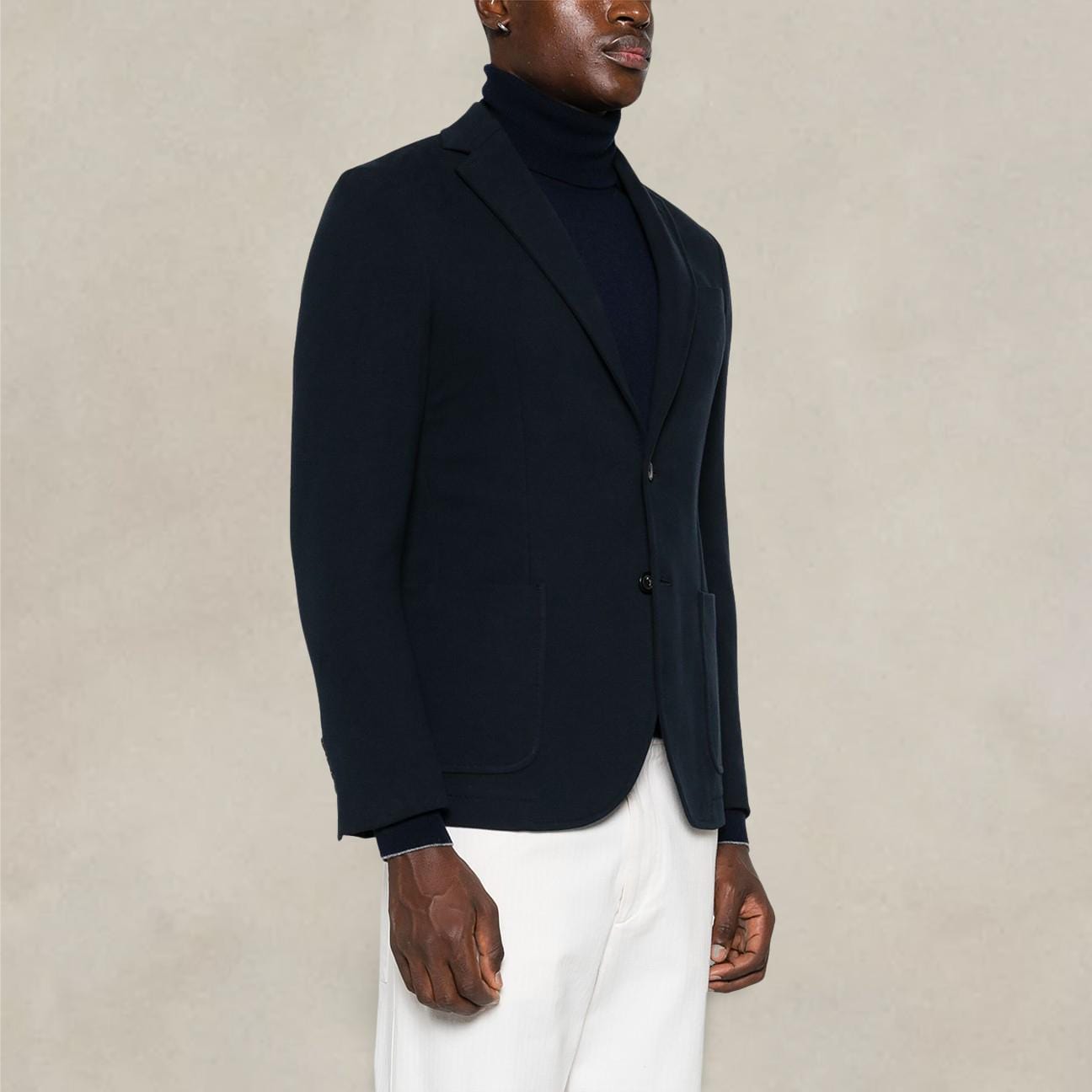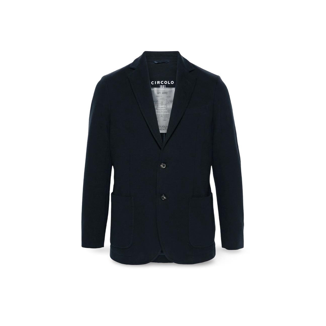 Coupe classique, boutonnage simple, revers classiques, deux poches plaquées devant, double fente arrière<BR />doublure partielle, ourlet arrondi