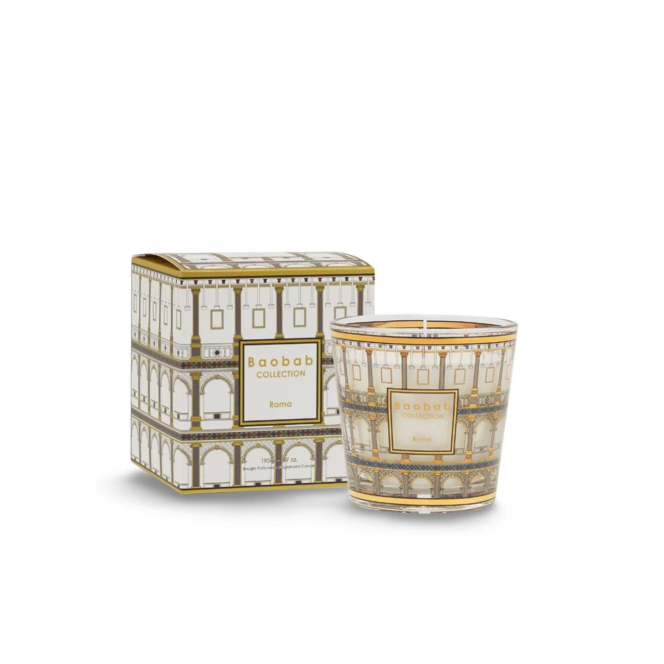 La bougie parfumée Rome est sérigraphiée d'or et de couleurs qui représentent l'architecture spectaculaire du Colisée. Nous l'avons réinterprété avec faste, lui donnant un style riche et sophistiqué où les frises dorées et colorées rappellent les plafonds des monuments de la Renaissance.