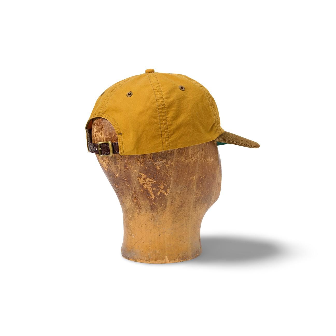 Il tessuto proviene da una storica manifattura scozzese specializzata nella produzione di cotone cerato sin dalla fine dell'800. Cappellino da baseball in stile vintage caratterizzato da una corona leggermente più profonda rispetto al modello standard. Parte superiore della visiera in velluto a coste sottili. Etichetta con logo stampata sul davanti. Listino in pelle sul retro con fibbia in ottone anticato.