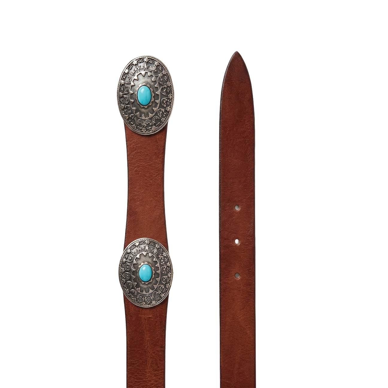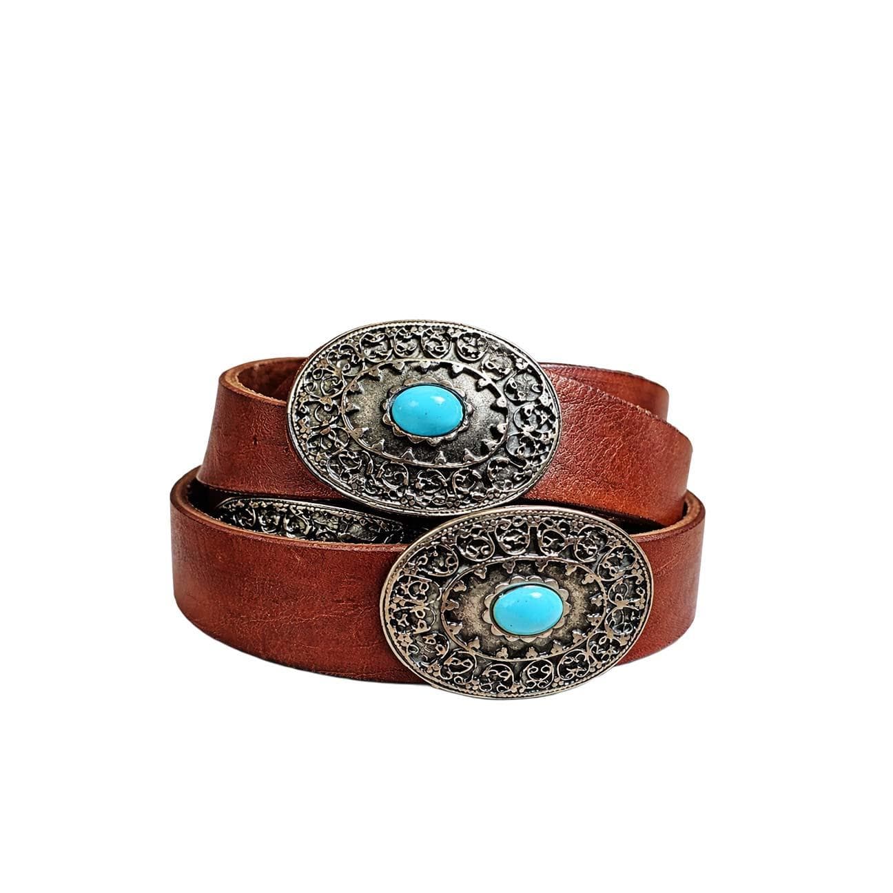 Cintura in pelle dal carattere deciso e artigianale, perfetta per aggiungere un tocco distintivo a qualsiasi outfit. Realizzata in pelle marrone di alta qualità, presenta una fibbia ovale decorata con raffinati dettagli lavorati e impreziosita da una pietra centrale turchese, che dona luminosità e personalità.Lo stile richiama influenze vintage e boho, rendendola ideale sia per look casual che per abbinamenti più ricercati. La struttura resistente e la cura nei dettagli garantiscono comfort e durata nel tempo.