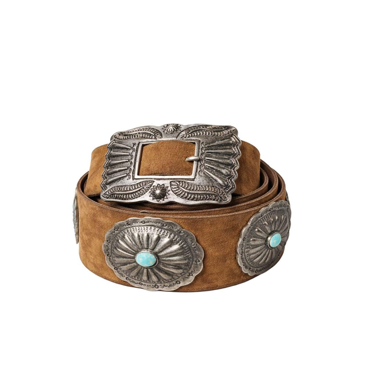 Cintura in pelle dallo stile western autentico, perfetta per aggiungere carattere e personalità ai tuoi look. Realizzata in pelle color cuoio con finitura morbida e naturale, è arricchita da conchos in metallo inciso con dettagli ornamentali e inserti effetto turchese che donano un tocco luminoso e distintivo. La fibbia importante, lavorata con motivi decorativi in rilievo, esalta l'estetica vintage e artigianale dell'accessorio, rendendolo protagonista dell'outfit. La combinazione tra pelle calda e metallo lavorato crea un equilibrio perfetto tra stile rustico e ricercatezza.