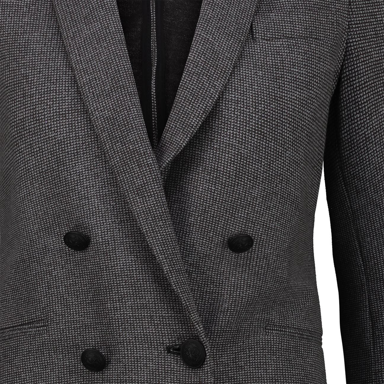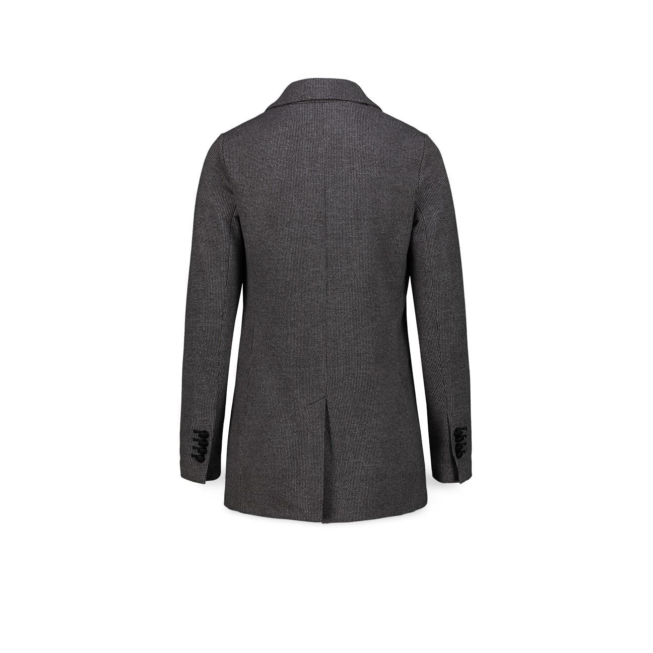 Vestibilità regoalre doppiopetto, rever classici, chiuso con bottoni taschio a filo sul torace du etasche a fiko davanti