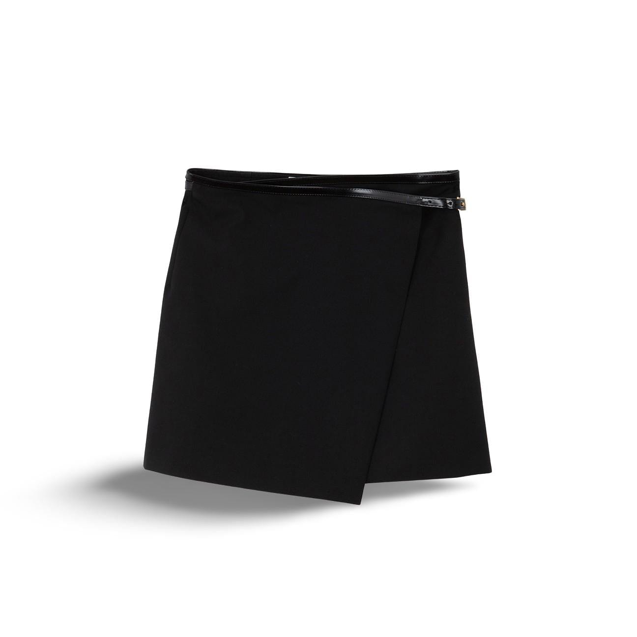 Minigonna in fresco lana, dal design semplice e pulito. Il capo presenta una chiusura a portafoglio, sottolineata dal sofisticato cinturino nero lucido con fibbia in galvanica oro.