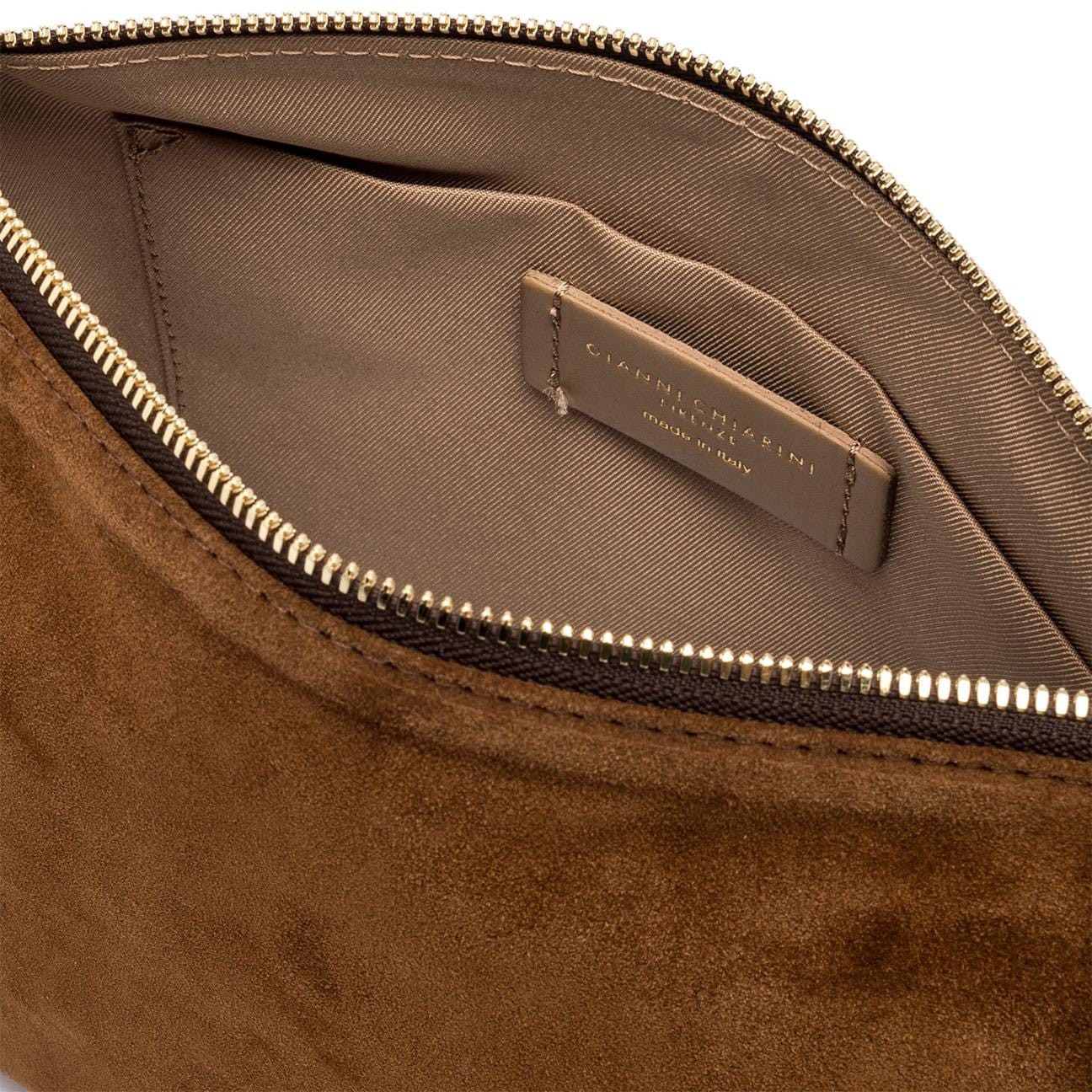 La borsa Nora Pouch by Gianni Chiarini Firenze è realizzata in morbida pelle scamosciata. È dotata di un cinturino in pelle che permette di portarla al polso e di una tracolla regolabile, entrambi removibili. Presenta una chiusura con zip per una maggiore praticità. Qui realizzata nella misura grande