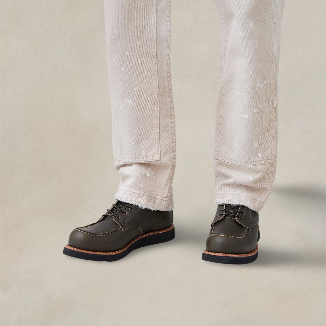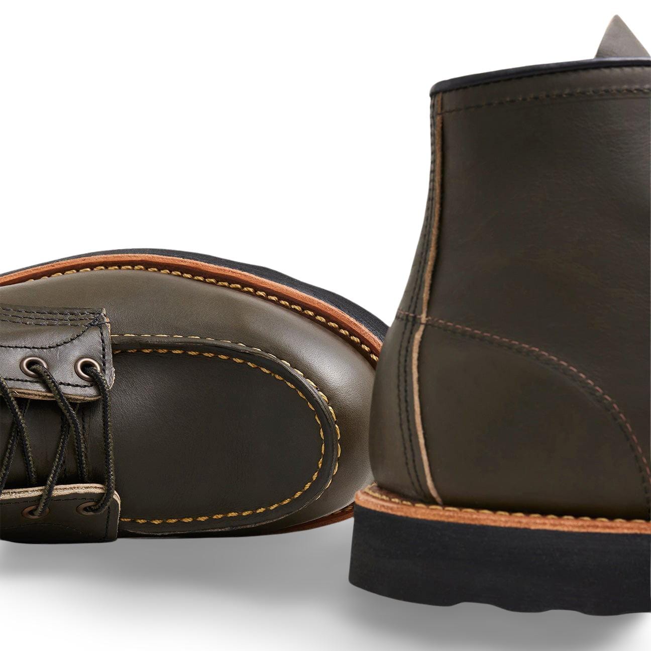 Red Wing Shoe 8828 è classico Moc Toe nel colore Limited Edition Alpine Portage Leather con pelle conciata ad olio , suola nera Traction Tred e cuciture con fili color champagne. Il Moc Toe Classic "6 è un modello Heritage che risale ai primi Anni '50.